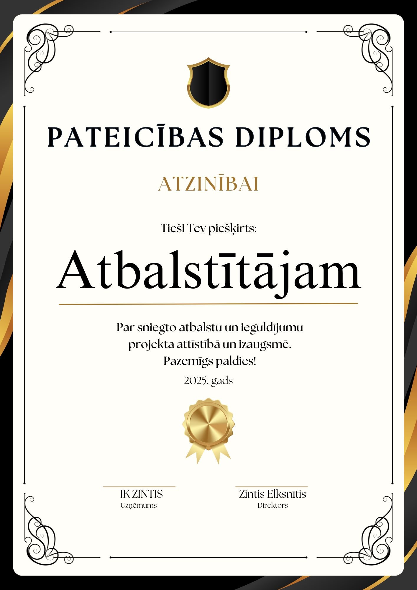 Sniedzot savu atbalstu projektam vai iniciatīvai, Tu pretī saņem šo Pateicības diplomu, kas kalpos kā atzinības un cieņas simbols.